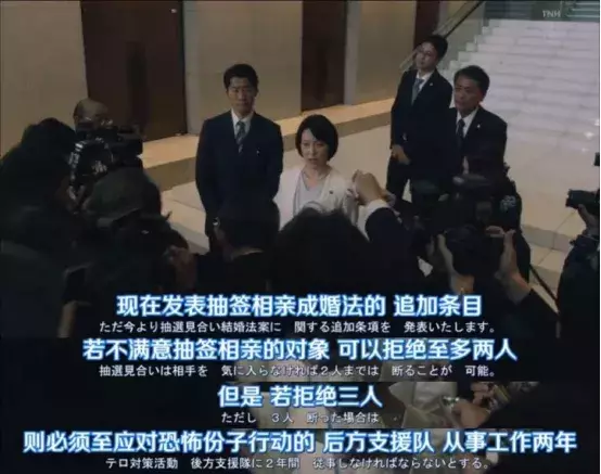 對負(fù)責(zé)抽選相親結(jié)婚法的大臣小野寺友紀(jì)子(巖村麻由美飾)的描寫也同樣令人在意。大臣是離異并育有一個女兒的女性。從官房長官的話來看,“婚姻失敗”、孩子“只有一個”等地方都被意味深長地諷刺了。
