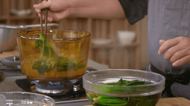 將菠菜放進(jìn)滾水中汆燙后,涼水降溫。