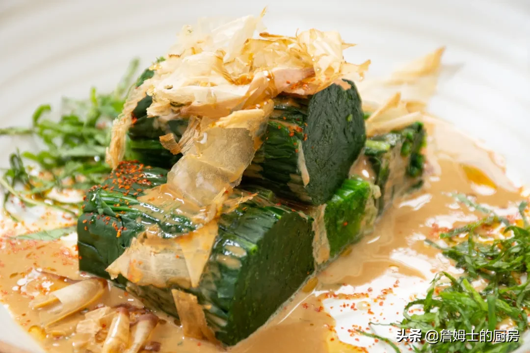 師父的這道菠菜卷太適合夏天了!因?yàn)橘酄C后還過(guò)了涼水,吃在嘴里特別清爽,但是又不會(huì)覺得單調(diào),因?yàn)橛兄ヂ獒u和味噌調(diào)制的濃郁香氣,還有七味粉帶來(lái)一點(diǎn)點(diǎn)辛辣的味道。師父說(shuō)這個(gè)菠菜卷可以提前做起來(lái)放冰箱,想吃的時(shí)候拿出來(lái)淋上芝麻醬就可以咯,趕快在家做起來(lái)吧~