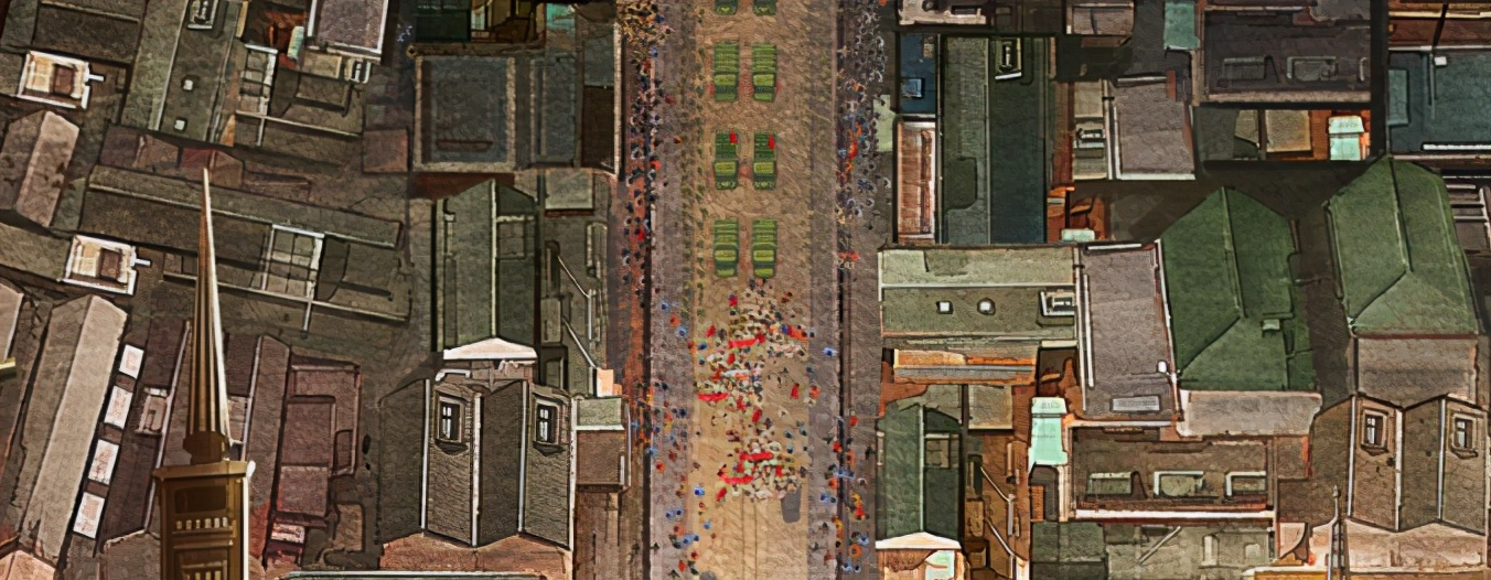 宏觀上看,一條主干道通向天空,路兩邊的房子密密麻麻。