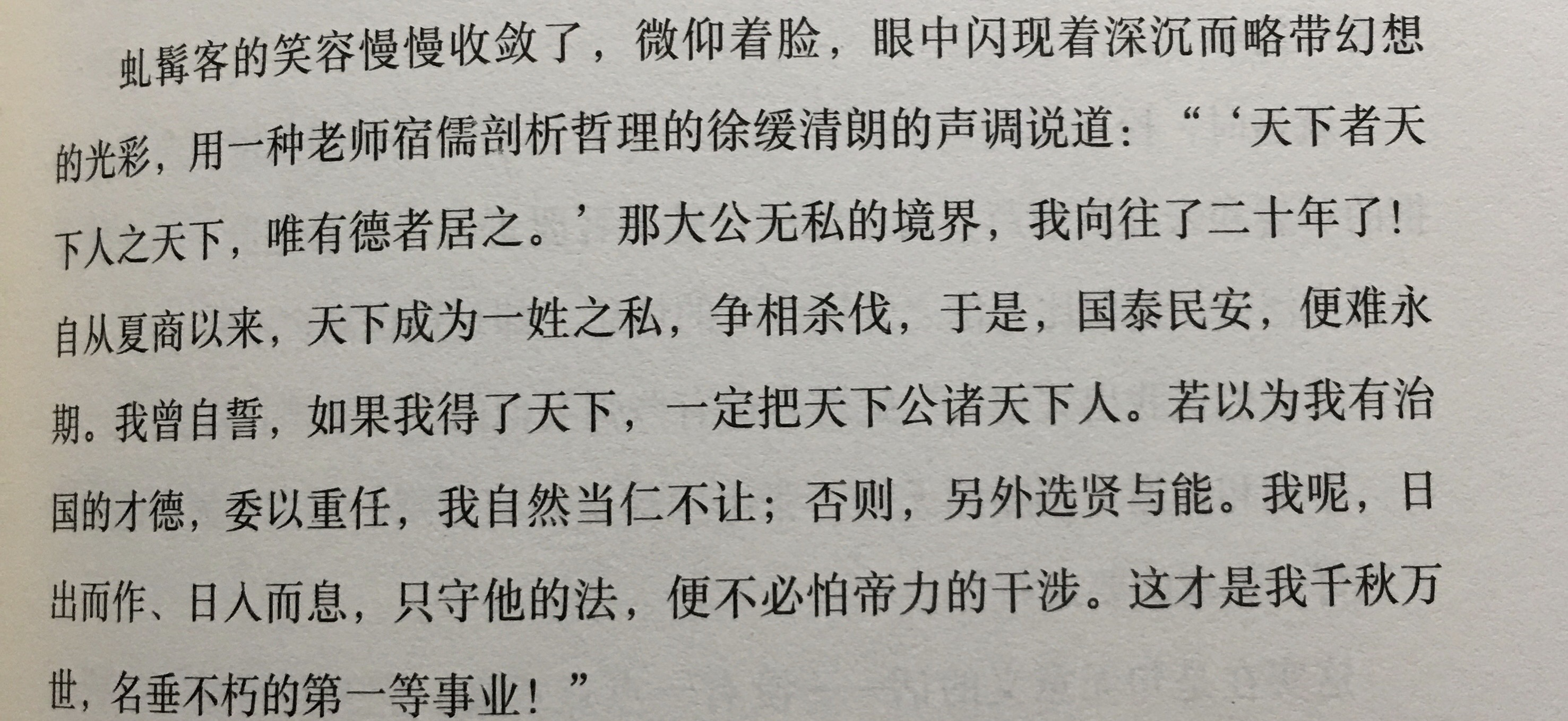 這番話別說(shuō)李靖和張出塵,便是身處現(xiàn)代的我們也會(huì)吃一驚。如果說(shuō)李靖和張出塵因所處的時(shí)代限制無(wú)法理解虬髯客的這番剖白,那正處于社會(huì)主義初級(jí)階段的我們多少能理解一二——正因?yàn)槔斫猓苡X(jué)出虬髯客的洞見(jiàn)何其深遠(yuǎn)。
