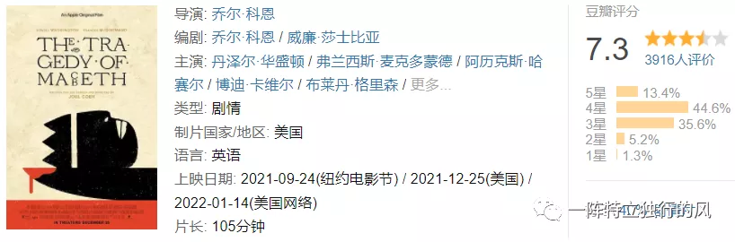 《麥克白的悲劇》改編自莎士比亞的經(jīng)典悲劇,講述了一位弒君者/麥克白深受權(quán)欲、幻念與恐懼折磨的故事。