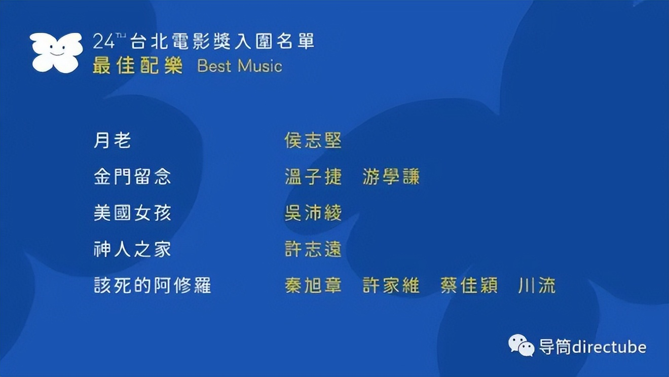 最佳配樂(lè)侯志堅(jiān)《月老》溫子捷、游學(xué)謙《金門(mén)留念》吳沛綾《美國(guó)女孩》許志遠(yuǎn)《神人之家》秦旭章、許家維、蔡佳穎、川流《該死的阿修羅》