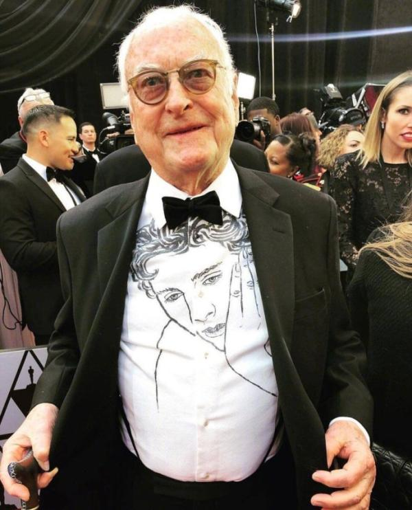 詹姆斯老爺爺?shù)囊r衫十分俏皮,上面印有《請(qǐng)以你的名字呼喚我》主演“甜茶”提莫西·查拉梅的頭像。