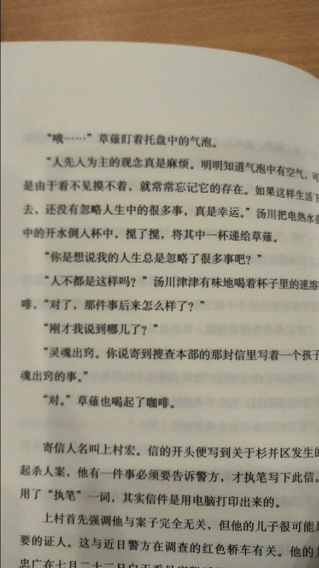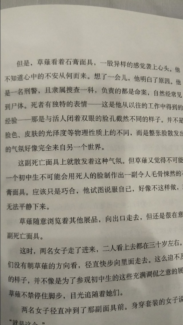 例如草薙剛看到石膏面具時的描述:草薙看著石膏面具,一股異樣的感覺襲上心頭…………死者有獨特的表情——這是他從以往的工作中得到的經(jīng)驗——那是無活人閉著雙眼的臉孔截然不同的樣子…………而是整張臉散發(fā)出的氣氛好像完全來自另一個世界。讀到這里,我不禁在想,