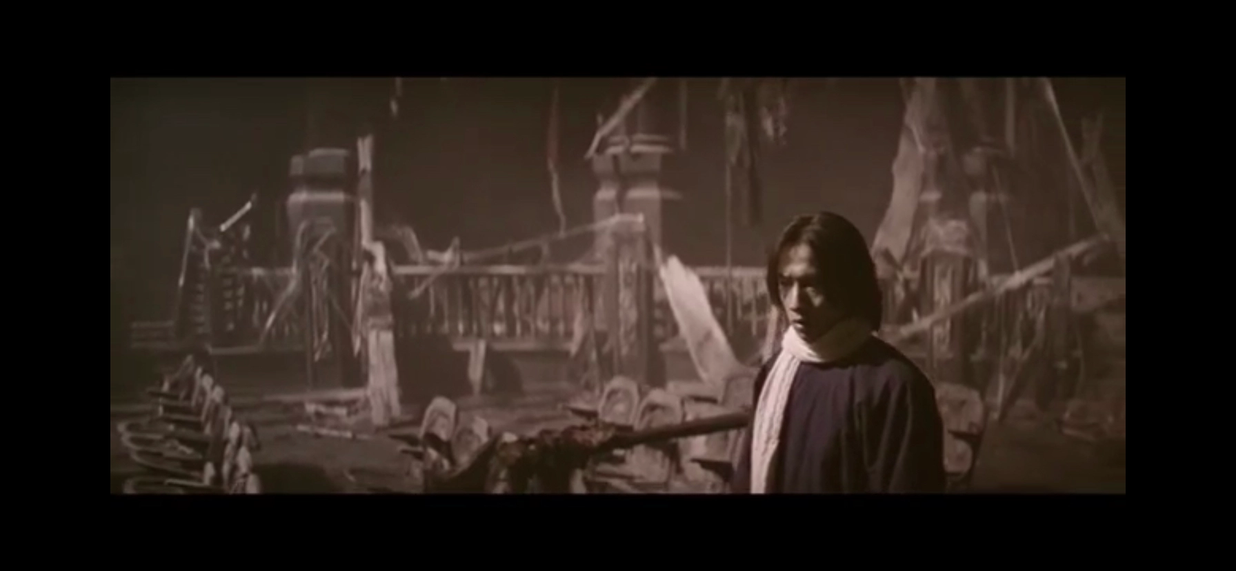 電影的開頭伴隨著驚悚的背景音樂和電閃雷鳴的畫面,著實(shí)讓我有些害怕,以為自己點(diǎn)錯了電影,看著屏幕里的演員介紹才松了口氣。鏡頭很快進(jìn)入主題,在充滿迷霧的林間小道,幾輛馬車迎面而來,一群青年演員正趕往新的劇院,也就是曾經(jīng)被大火燒毀的宋丹平演出的劇院,一路奔波到劇院時,劇院的環(huán)境破舊不堪,甚至還帶有一絲“鬼屋”的恐怖氣息,所有同伴選擇在外等候看門人時,韋青卻很膽大的在探索著劇院里曾經(jīng)發(fā)生的故事一般,四處環(huán)視,像產(chǎn)幻般看見杜云嫣在奔跑并且聽見劇院傳來宋丹平隱約的歌聲。這也為后面韋青成為第二個宋丹平的劇情做了很好的鋪墊。