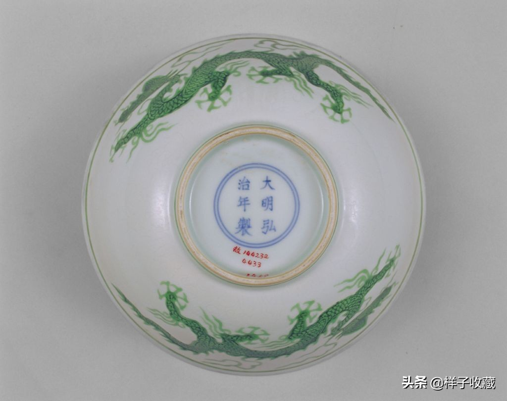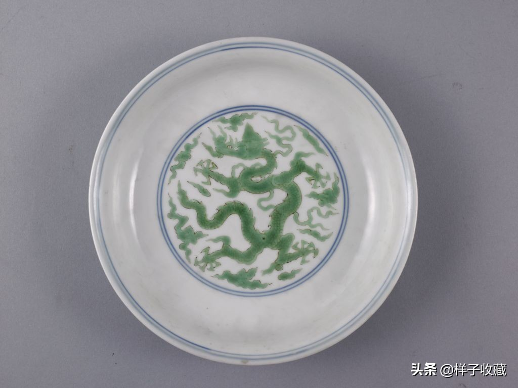明代弘治瓷器以黃釉最為出名,是明代黃釉瓷器的典范,今天樣子收藏介紹一下弘治白釉綠彩瓷器。白釉綠彩瓷始于明代永宣時期,成化、弘治、正德均有燒制,三朝器物其造型,紋飾均類似,多以龍紋為飾。有盤、碗等器型,潔白的釉地上繪以綠彩紋飾,對比鮮明,視覺沖擊大,賞心悅目。清代這種白釉綠彩瓷器仿品頗多,以清代康熙瓷器仿造的最好。
