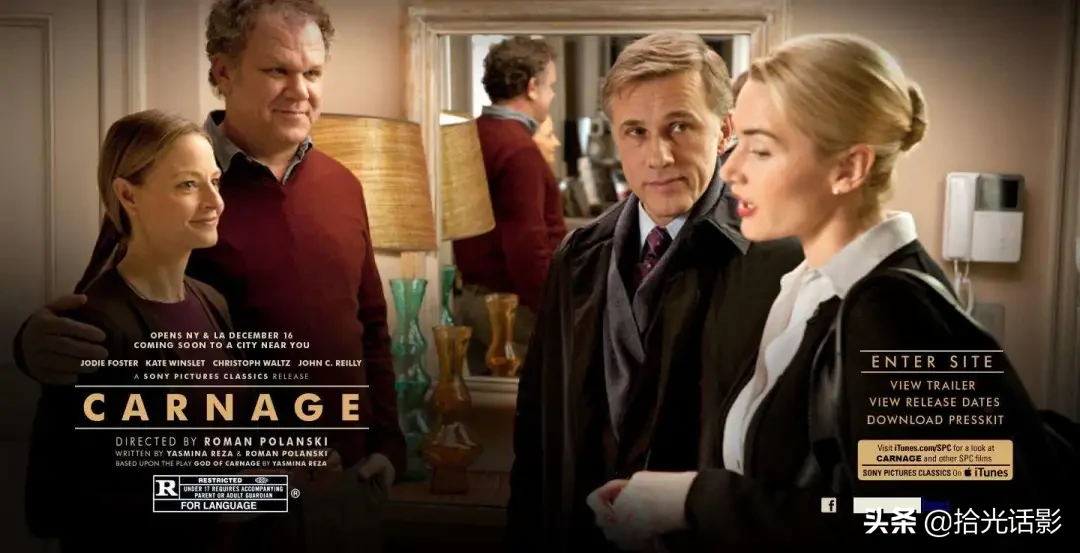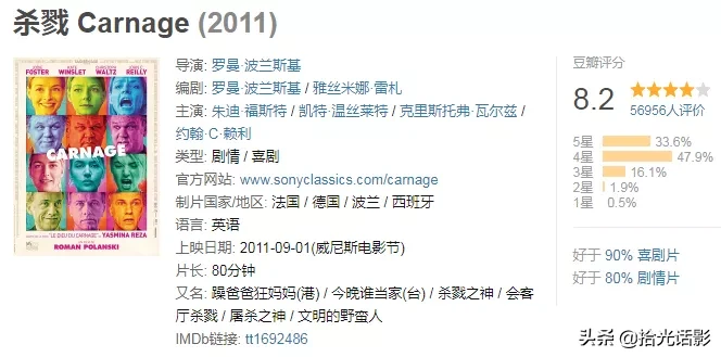 這部話劇類型的電影《殺戮》,我是沖著片名和演員去看的,結(jié)果一點血腥和暴力都沒有,整部電影場景撇開片頭片尾,都在一個房子里,就4個人,全憑演技,只要一個演員演技掉鏈子,這部電影就沒法看下去。殺戮,有的時候不一定身體上的傷害,言語,冷暴力的傷害有時候更讓人瘋狂。