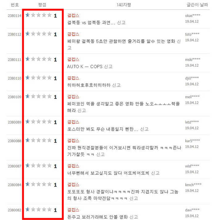 因為該部電影,在韓國是首次采用女性演員作為刑警片的主演,而且一來還是兩個女性主演刑警,這部電影被很多韓國的男性網(wǎng)友認為是過分的“女權(quán)電影”,而在上映前在各大評分網(wǎng)站惡意地打出低分。