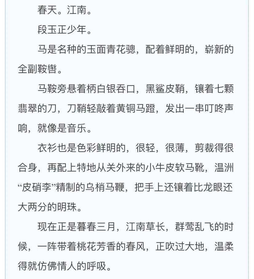 同是名門世家子弟,同是青春年少,我們來比較一下古龍《碧玉刀》中的段玉年少輕狂的描寫: