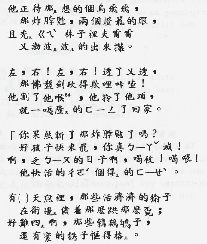 接下來(lái)作者列舉了多種翻譯版本的胡言詩(shī)《jabberwocky》,《歌謅胡》、《胡言亂語(yǔ)》、《恐龍怪獸》、《尖嘴妖之歌》、《蛟龍杰伯沃基就誅記》、《扎勃沃龍》。最后列舉了一個(gè)作者覺(jué)得最為有趣的版本,趙元任先生翻譯的《走到鏡子里》(商務(wù)印書(shū)館,2002)。