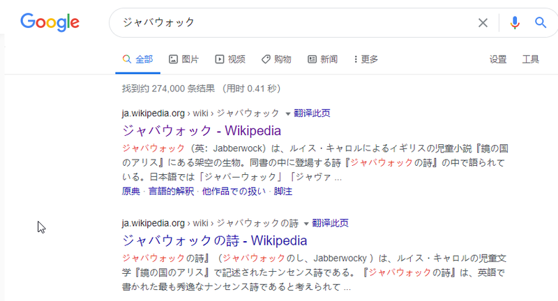可以看到日服的稱呼為【ジャバウォック】,那我們?nèi)ニ阉鬟@個(gè)日文會(huì)出現(xiàn)什么呢?既然是日語(yǔ),那咱們谷歌一下好了。谷歌到的結(jié)果,前兩個(gè)結(jié)果都是wiki,點(diǎn)進(jìn)去看了之后會(huì)發(fā)現(xiàn),這個(gè)日語(yǔ)詞出處是日文版的《愛(ài)麗絲鏡中奇遇》。