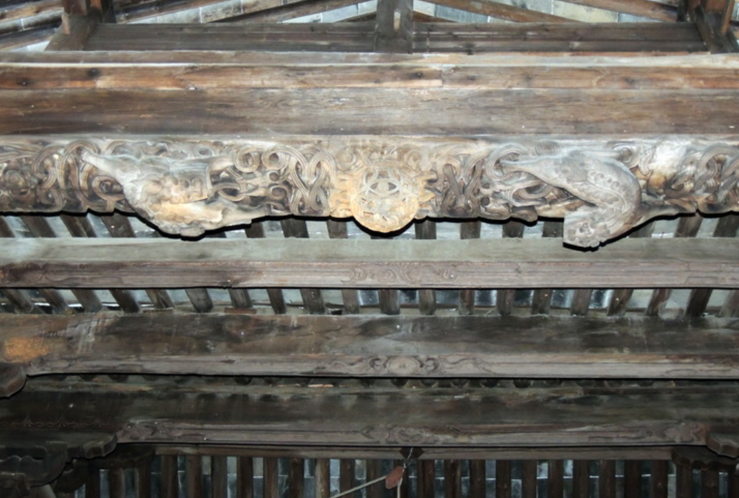 在光裕堂的正廳內,房屋頂部有一根粗壯的房梁,長約5.6米,雖然看起來烏漆嘛黑留下了歲月的痕跡,但是卻愈發(fā)顯得堅毅和結實。如果您仔細觀察,不僅能發(fā)現房梁上底面有魚鱗般的浮雕,還能看到房梁的正中間雕刻出一個凸起的小木球,直徑約18厘米,并且木球兩側各有一只貔貅環(huán)繞,似乎在保護這顆獨特的木球,讓人想起了四個字——珍貴無比。