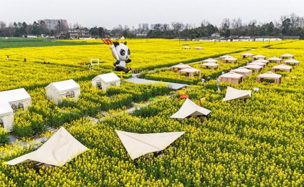 3月8日,在成都崇州市道明鎮(zhèn),游客在油菜花田中觀光用餐。新華社記者 王曦 攝