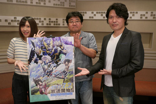 首先介紹下?lián)斀庹f的3位嘉賓(圖左起):飾演本作主人公艾爾涅斯帝·埃切貝里亞的高橋李依、監(jiān)督山本裕介、飾演艾爾的父親馬提斯并參與本作原畫、機械設計的天神英貴。