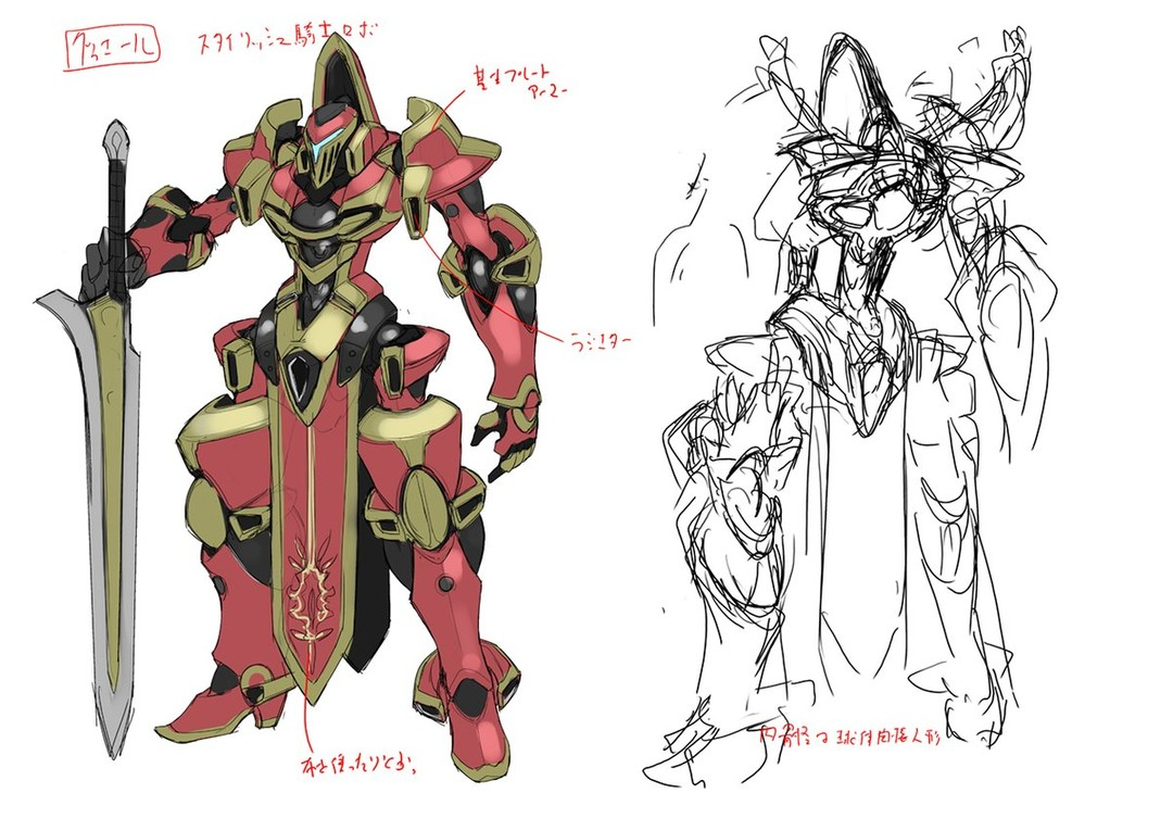 黑銀設計的原機設,刊載于小說文庫版的古耶爾。黑銀最早設計的幻晶騎士,在設計幻晶騎士時黑銀提出的兩個概念:① 只有這部作品才有的外形;② 能夠施展出激烈戰(zhàn)斗的關節(jié)設計。上圖的背面則因為一些原因沒能展示出來。最能體現(xiàn)本作機體的設計就是像魔術師一樣的裝束,像身著斗篷一樣。最能夠反應出動作的部分則是肘部和膝部。另外,因為只是為了插畫用的設計,所以沒有詳細設計機體的內構、標記等細節(jié),這些則由動畫的機械設計天神英貴來補充添加。