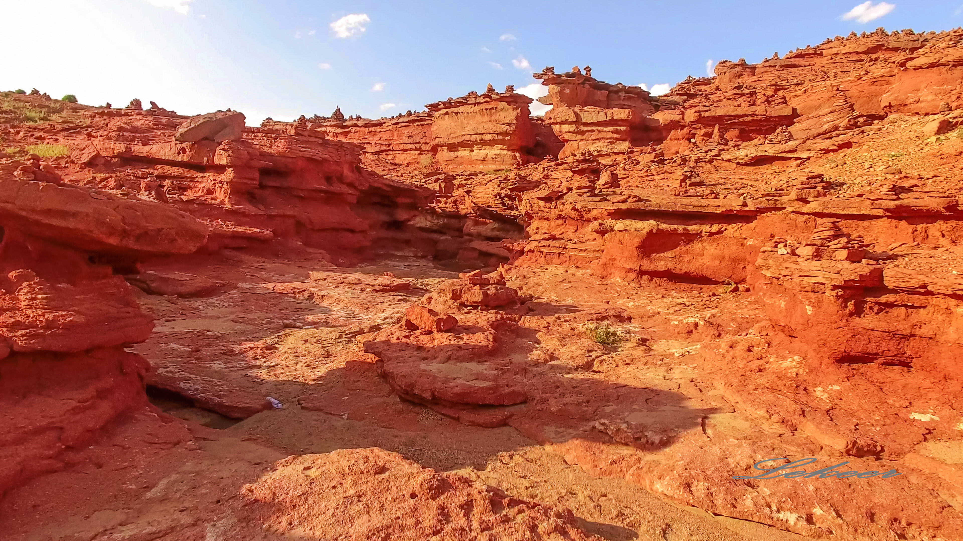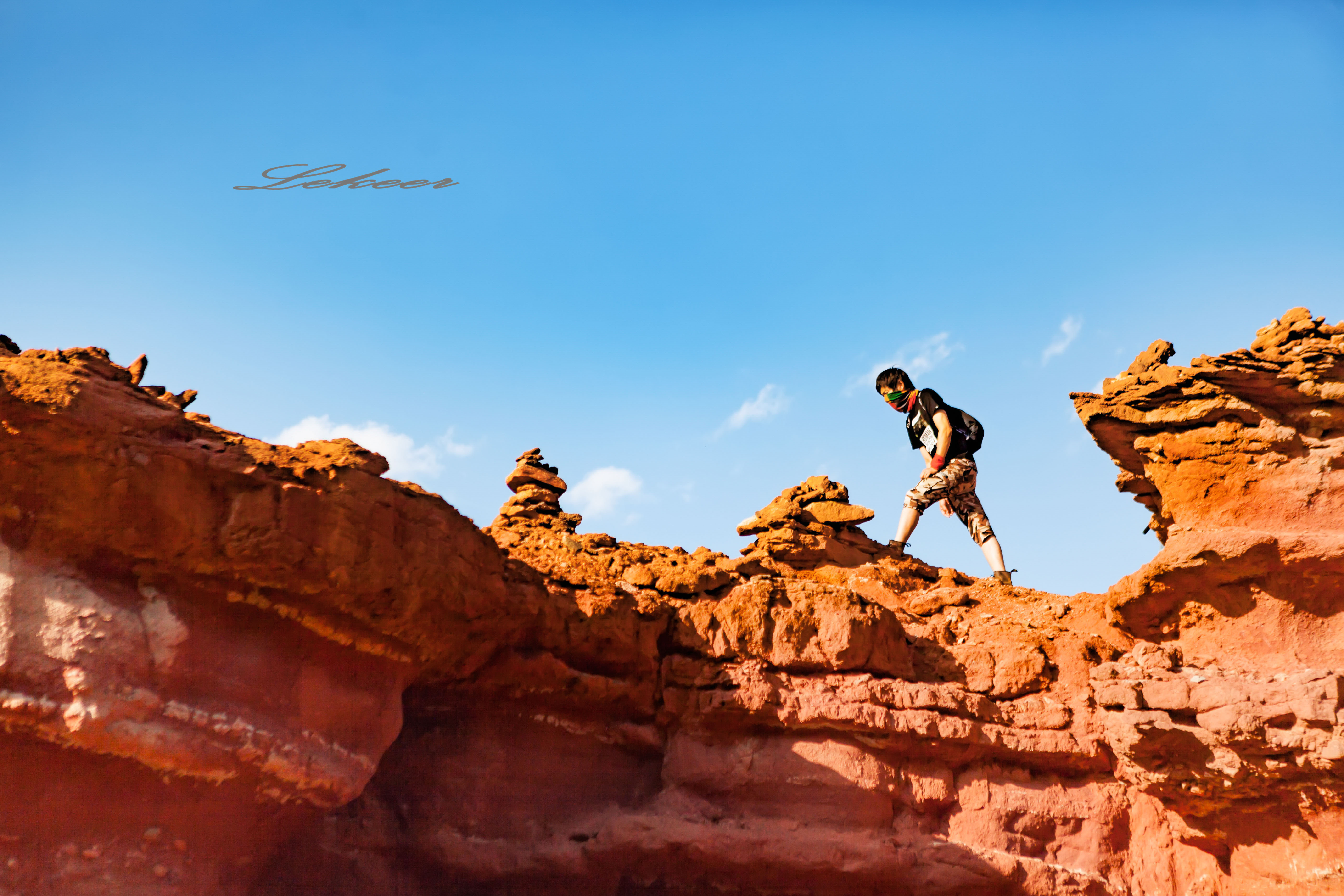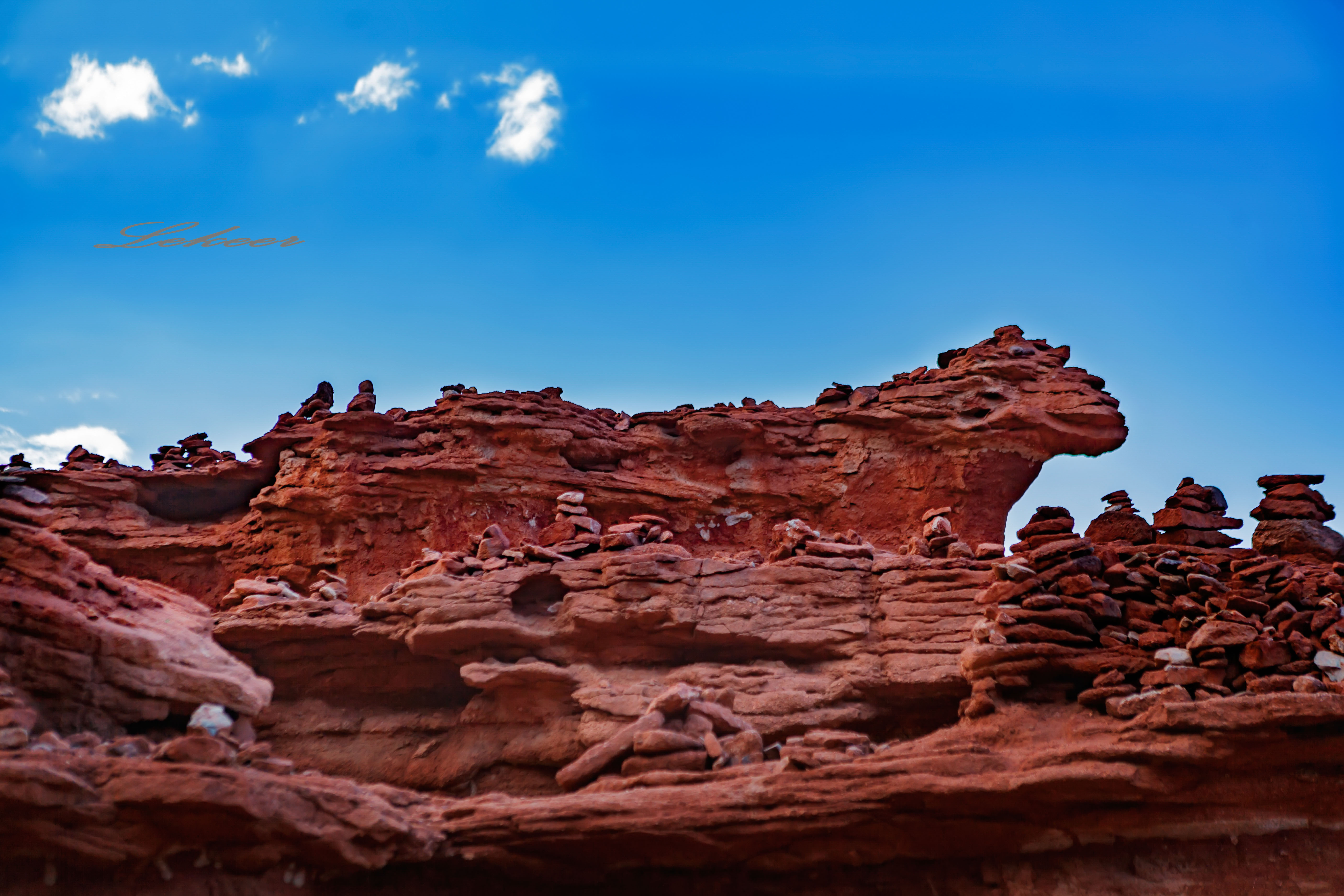 受小灰機(jī)高空鳥瞰信息的極度誘惑,徒步沙漠款的西部夢幻大峽谷兩三公里后,小伙伴們沿峽谷右側(cè),勇敢地爬上谷頂,肉測這一峽谷形狀。谷頂上,到處堆滿的瑪尼石堆,凝結(jié)著當(dāng)?shù)厥来貍鞣鸾绦疟妰?nèi)心祈愿的神秘能量,在雅丹與丹霞結(jié)界的環(huán)境里,這神秘的力量,更顯得此地在無限蒼涼中的鬼魅莫測……