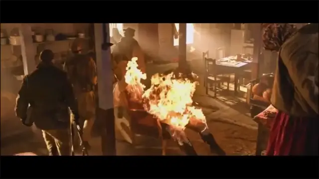 恐怖分子走后,美軍小分隊(duì)從夾縫里出來(lái),想要進(jìn)一步行動(dòng)時(shí)。原本被打暈了的女主人突然從房?jī)?nèi)沖了出來(lái),抱著一個(gè)炸彈,在美軍群中炸開。并喊出了一個(gè)單詞“vetrulek”,對(duì)他們下下了詛咒,讓他們不得安生。